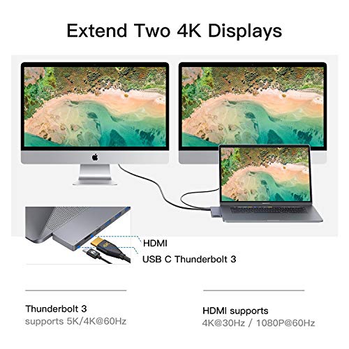 【4K HDMI & Thunderbolt 3】: Admite la conexión simultánea de dos pantallas y puede mostrar dos pantallas diferentes. Con la salida 4K HDMI, puede reflejar o ampliar la pantalla de su MacBook en su televisor, monitor o proyector. El puerto superior es Thunderbolt 3, Transferencia de datos y video soporta máx 40Gb / s, 87W de potencia PD y 5K UTRHD.
